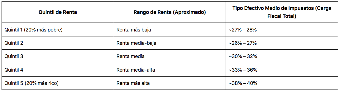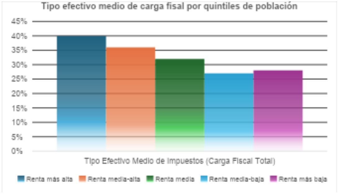 El tipo efectivo medio (el porcentaje total de la renta pagado en impuestos) para el 20% más pobre es sorprendentemente alto, e incluso puede ser superior al que soporta el 1% de los hogares más ricos del país. Aunque los impuestos directos son progresivos, la combinación de toda la carga fiscal (directos, indirectos y cotizaciones) hace que el 20% de la población más pobre soporte una carga fiscal total (tipo efectivo) muy elevada, cercana al 28% de su renta.