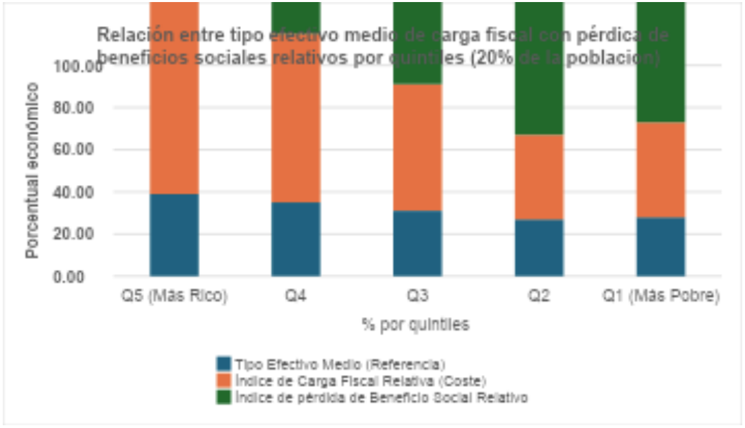 Existe un beneficio social relativo en relación con la carga fiscal soportada por cada quintil, proporcional a la carga soportada, de forma que los quintiles de mayor poder adquisitivo tendrán en teoría un beneficio social relativo bajo con relación a su carga impositiva, y los más pobres alto.