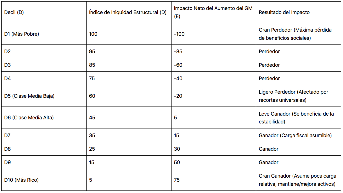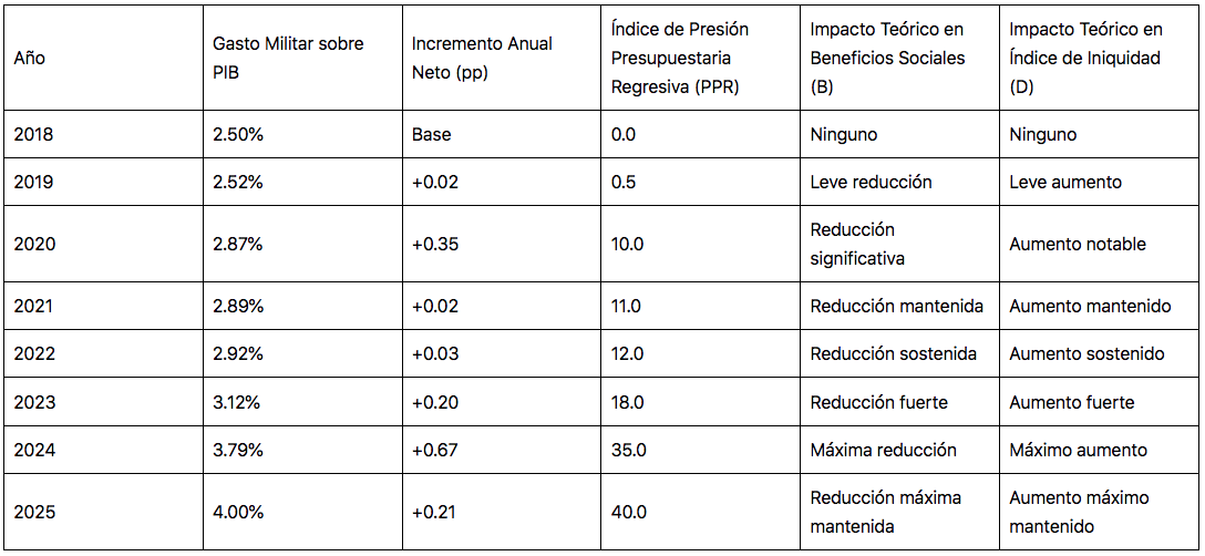 Sobre estos parámetros, he elaborado una tabla de cómo impactará la evolución de un aumento del gasto militar en términos de presión presupuestaria regresiva sobre el conjunto de la población, lo que nos da una aproximación de la correlación con la reducción general de beneficios sociales para el conjunto de la población y una conclusión evidente: aunque haya quien se beneficie de ello, todos perdemos como sociedad.