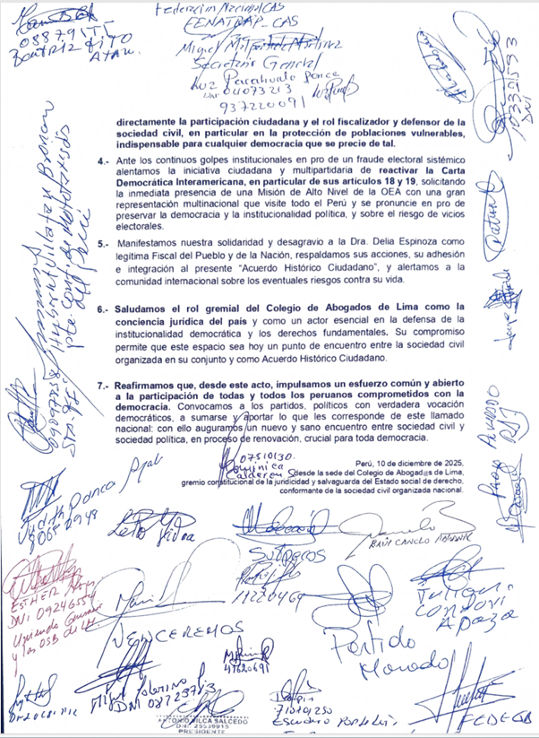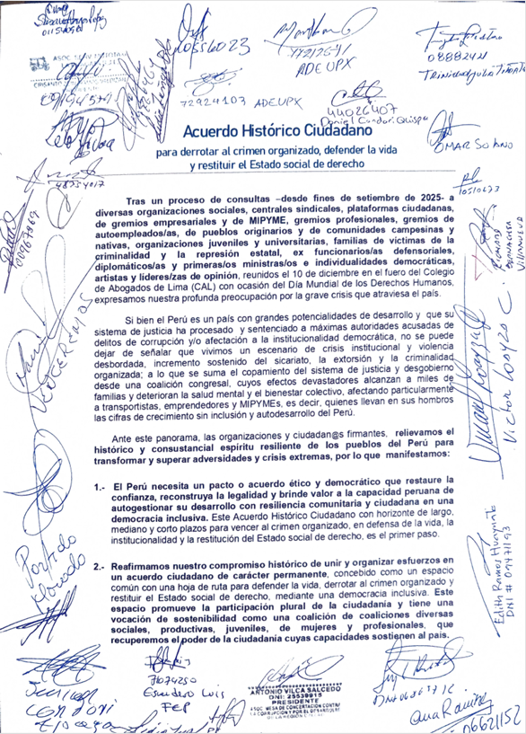 Unidos por un buen gobierno. El Colegio de Abogados de Lima (CAL) liderados por el decano Raúl Canelo, y decenas de instituciones de la sociedad civil organizada firmaron el Acuerdo Histórico Ciudadano (AHC) para derrotar al crimen organizado, defender la vida y restituir el Estado social de derecho, en una alianza que busca salidas a la crisis político-social que atraviesa el Perú.
