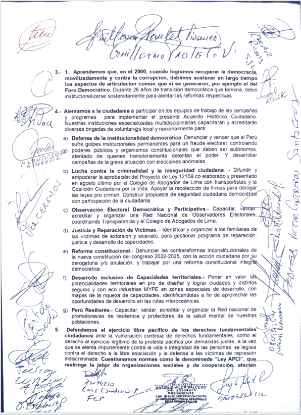 Los organizadores alentaron a la ciudadanía a suscribir y participar en los equipos de trabajo del Acuerdo Histórico Ciudadano en las temáticas de: defensa de la institucionalidad democrática, lucha contra la criminalidad, observación electoral, justicia y reparación de víctimas, reforma constitucional, desarrollo de capacidades territoriales y Perú resiliente.