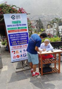 G.R.: Se sabe que hay leyes pro-crimen. La Madre del Cordero era la llamada 3208, que es una ley que define qué cosa es “crimen organizado”. Y bajo este concepto de crimen organizado nuevo, que dice que “el crimen organizado es cometido por determinados criterios de organización que tienen un fin económico”. Por lo tanto, los partidos políticos han salido de ese concepto de crimen organizado. Antes los partidos políticos estaban siendo investigados si había indicios. Por ejemplo, Fuerza Popular era uno de los partidos que estaban con indicios. Y eran sujetos de investigación. Ahora están libres. Los excluyen si no tienen esos requisitos. Entonces han hecho una norma para poder salir ellos de la tipología del crimen organizado.