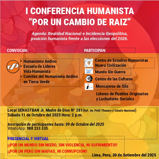 Con la participación de más de 40 líderes nacionales, el pasado sábado 11 de octubre se realizó la I Conferencia Humanista “Por un cambio de raíz” en la ciudad de Lima, Perú. La conferencia planteó un debate sobre la realidad nacional a través de cuatro anteproyectos: geopolítica y futuro de la humanidad, Latinoamérica libre de guerras, realidad nacional y, posición del humanismo andino frente a las elecciones del 2026.
