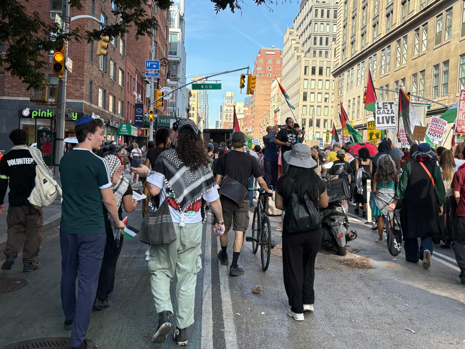 A nuestro alrededor bulle un hervidero de activistas —ya he comprado cuatro fanzines, el fantástico New York Crimes y ya no sé dónde meter los folletos de las muchas iniciativas. Llega otro chico; también es judío pero no religioso —en la cabeza no lleva la kippáh, sino una bandana a cuadros blancos y negros— y reparte folletos informativos de un grupo judío activo en la defensa del pueblo palestino. Me recuerda a los amigos milaneses de «Mai Indifferenti», de los primeros en su comunidad en tener el valor de alzar la voz y decir «¡NO! Nosotros no estamos de acuerdo!»