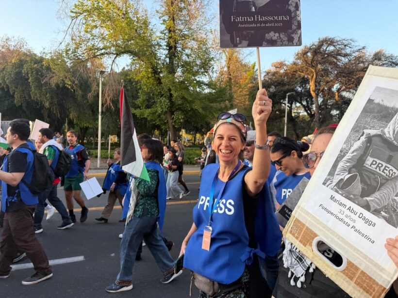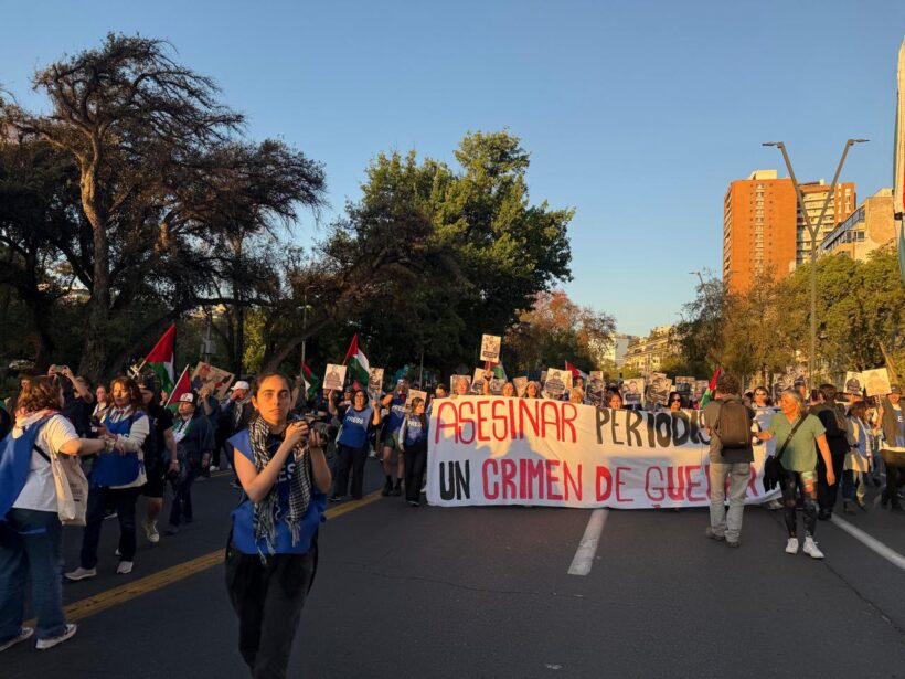 “A dos años del genocidio en Gaza, los periodistas firmantes —agrupaciones, medios y profesionales de la comunicación— levantamos la voz para denunciar el asesinato sistemático e impune de periodistas palestinos por parte del ejército israelí, así como el bloqueo total que impide la entrada de prensa internacional a la Franja de Gaza”, declara Ciper en su llamado, al cual Pressenza también se ha sumado con su presencia en la marcha.