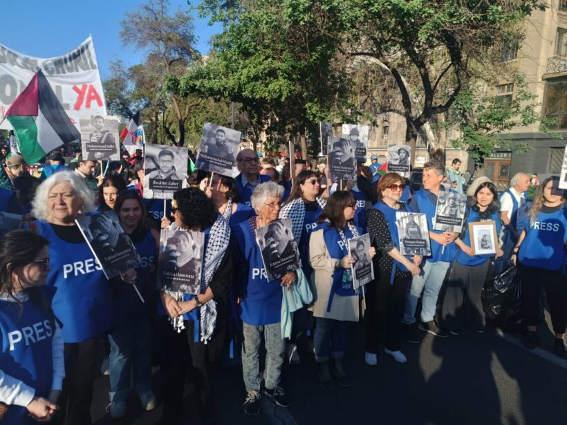 En esta última manifestación, se destacó el llamado del bloque de periodistas, viendo como protagonista a Ciper y la presencia de Colegio de Periodistas, Red de Periodistas Migrantes, Sindicato Litoralpress- Simbiu, quienes se han hecho reconocibles con pectorinas de prensa y alzando la memoria de los más de 200 periodistas palestinos asesinados en Gaza. Cada periodista levantó una imagen con el nombre, la edad y la fecha de asesinato del colega, expresando solidaridad con quienes siguen arriesgando la piel para hacer la labor de romper el embargo mediático que atañe a Gaza. Al llamado se han sumado premios nacionales de periodismo, presidentes y directores de organizaciones y medios y periodistas independientes.