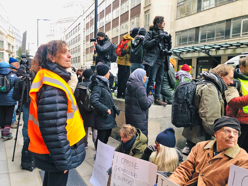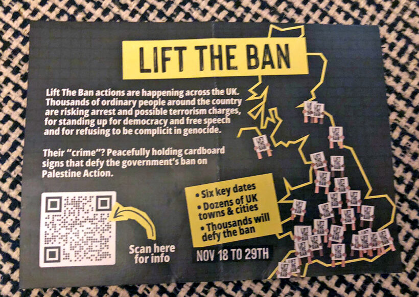 Esta acción se encuadra en la campaña «Lift the ban» (Levanten la prohibición) que está teniendo lugar del 18 al 29 de noviembre en docenas de ciudades y localidades de todo el Reino Unido, desafiando la prohibición del gobierno británico y avisando que «miles de personas comunes en todo el país corren el riesgo de ser arrestadas y enfrentar posibles cargos de terrorismo, por defender la democracia, la libertad de expresión y por negarse a ser cómplices del genocidio».